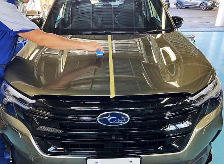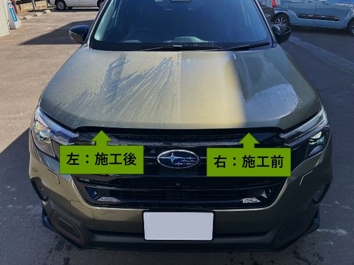 分かりやすいように、ボンネットの左右半分を分けて施工した写真を撮りました。↓↓