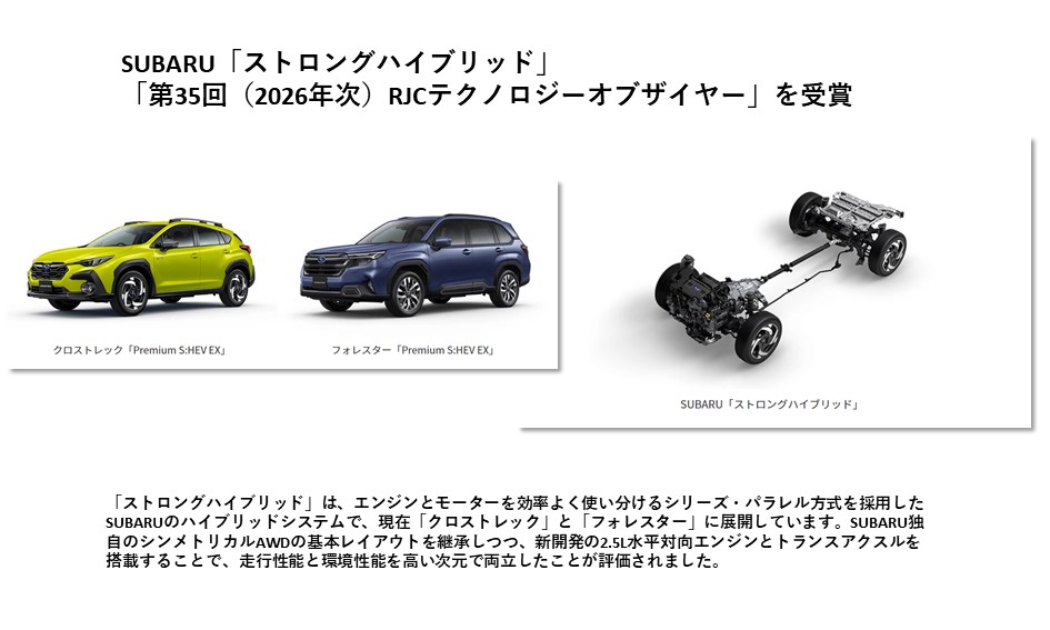 技術(テクノロジ-部門)でSUBARUストロングハイブリッド 「第35回(2026年次)RJCテクノロジーオブザイヤー」を受賞した喜ばしいNEWSをお伝えします。