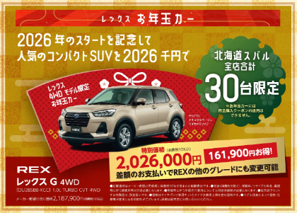 2026年のスタートを記念して、北海道スバル全店30台限定でREX Gグレード 4WDを税込¥2,026,000で販売いたします!