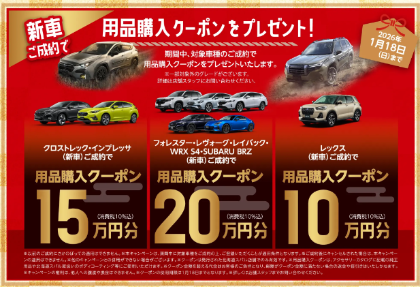 1月18日(日)まで!車種に応じて10万円、15万円、20万円(税込)の用品購入クーポンをプレゼント!