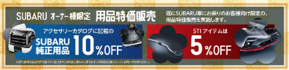 SUBARU純正用品は10%OFF!そして気になるSTIアイテムは5%OFFといつもよりお得に!