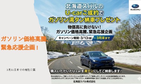 さて!今度の3連休はカースポット厚別にお越しください!今ならU-CARご成約で納車時ガソリン満タンサービスします!