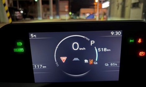 スタートから67㎞走行、予測走行可能距離518㎞、充電量85%